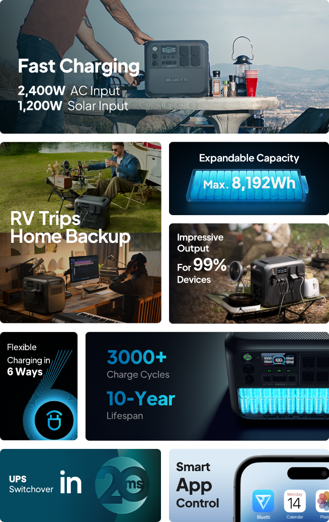 When paired with D40*, AC200L transforms into a high-efficiency DC power source, offering 12V seamless charging options for your RV batteries, as well as surveillances, routers, speakers, and radios at home or on the go.