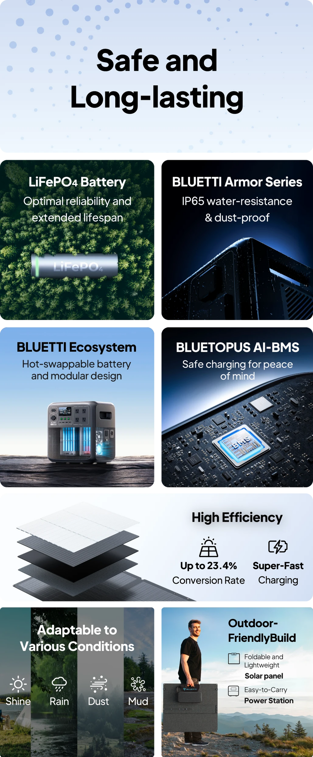 Get rid of fossil-fueled generators that produce toxic emissions and annoying noise. Discover how BLUETTI solar generators transform the way you embrace the great outdoors and beyond. Charge your electronics, keep your refrigerator running, or light up your campsite—all with the sun's energy.