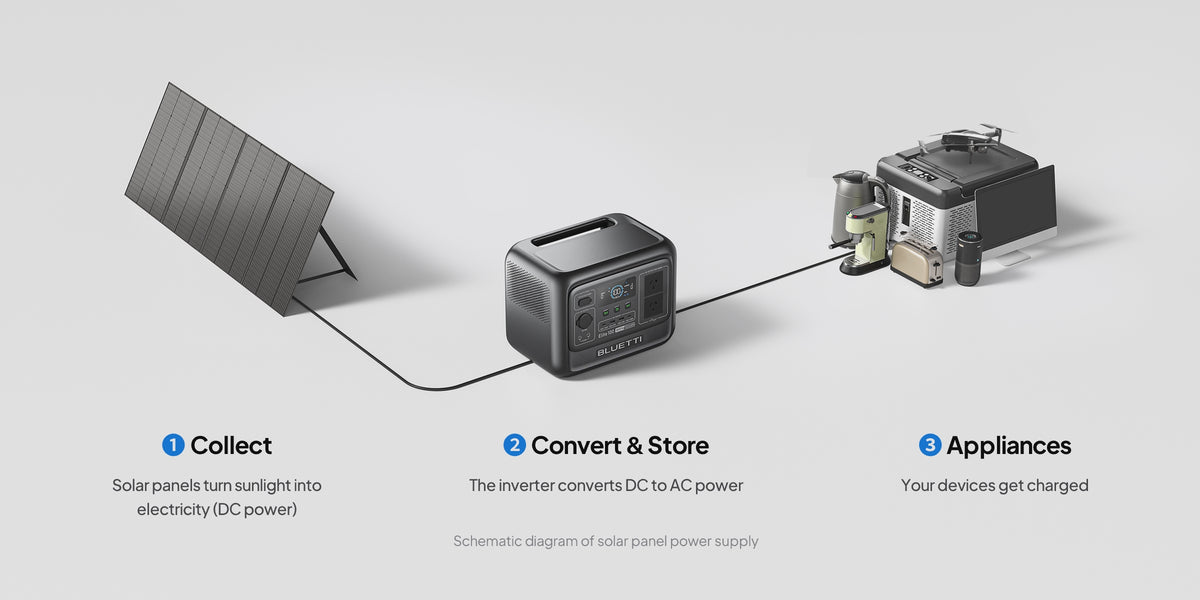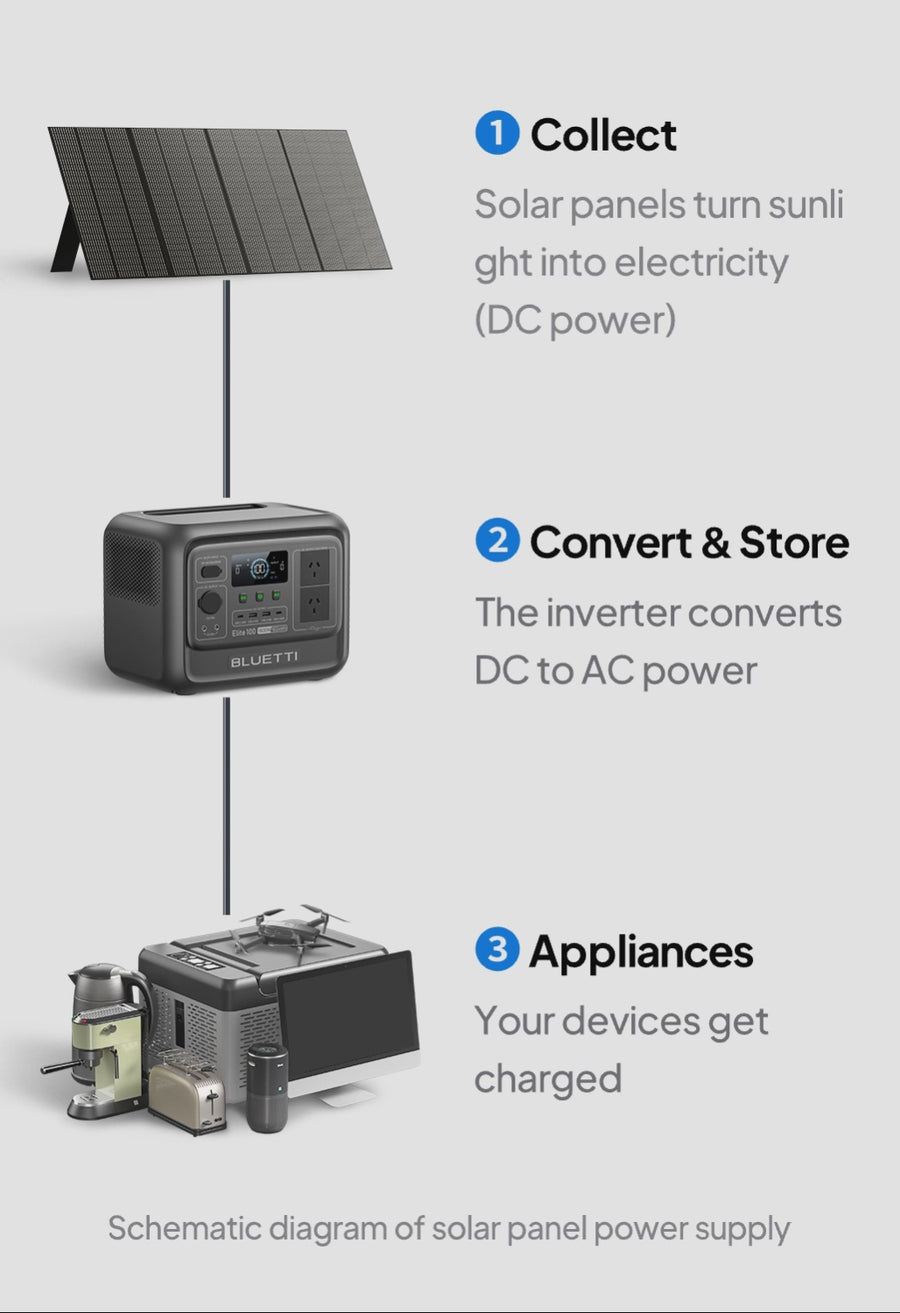 - A1: A solar panel captures sunlight and converts it into electricity. BLUETTI panels use high-efficiency monocrystalline cells to make the most of every ray—delivering reliable power wherever there's sun.
