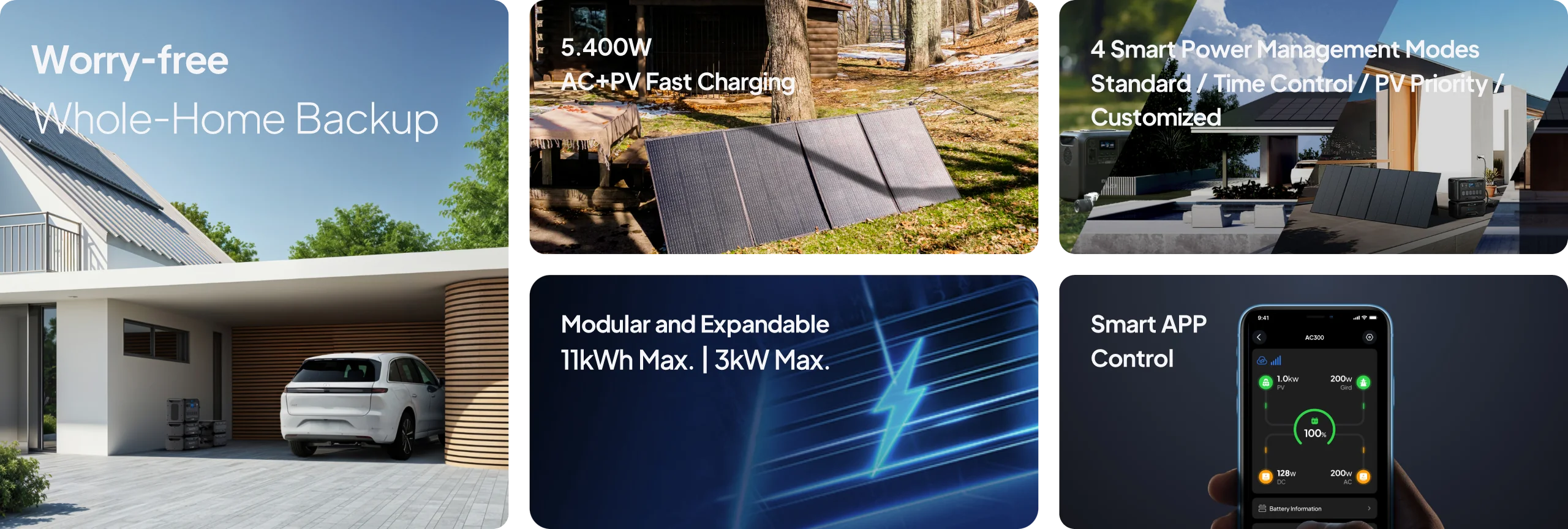 With 100% modular design, AC300 allows for a scalable capacity ranging from 2764,8Wh to a staggering 11.059,2Wh!