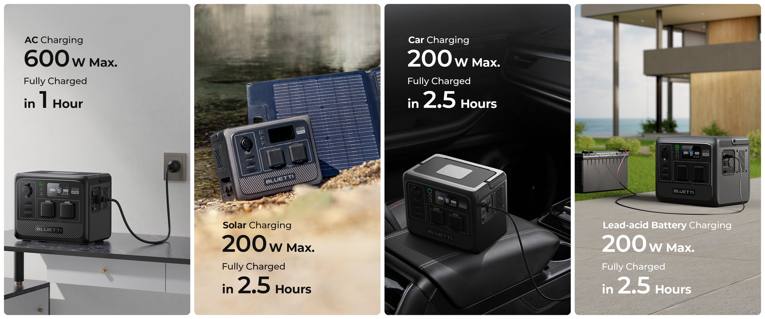 A:The AC60 supports a maximum input of 600W. Plug it into a wall outlet, turn on the Turbo Charging mode on the BLUETTI App, and you can charge it up in 1.2-1.7 hours.