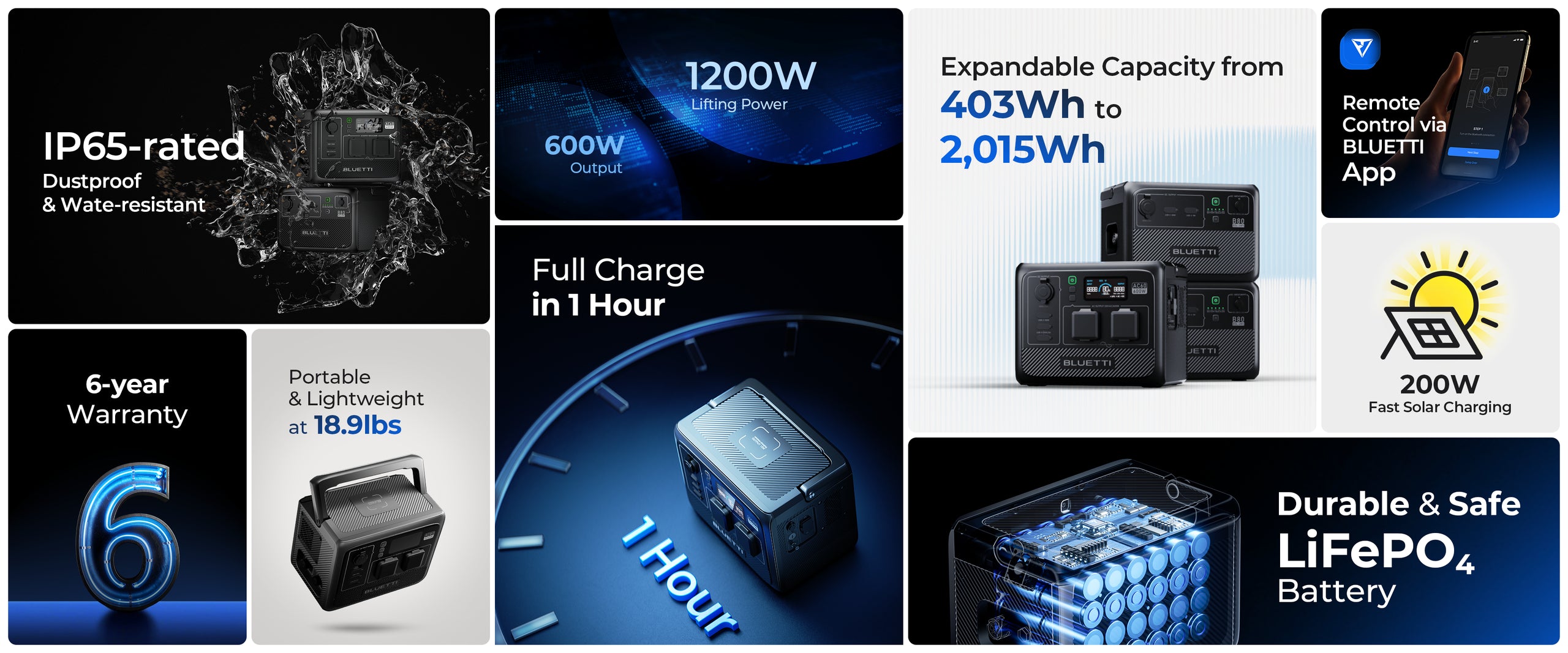 403Wh(22.4V,18Ah)2×230V/2.6A,600W In total600W Max.200W Max.,12-28VDC,8ALiFePO₄3000+ CyclesBLUETTI App (Bluetooth)11.42*8.07*9.21in / 290*205*234mm20.06 lbs(9.1 kg)