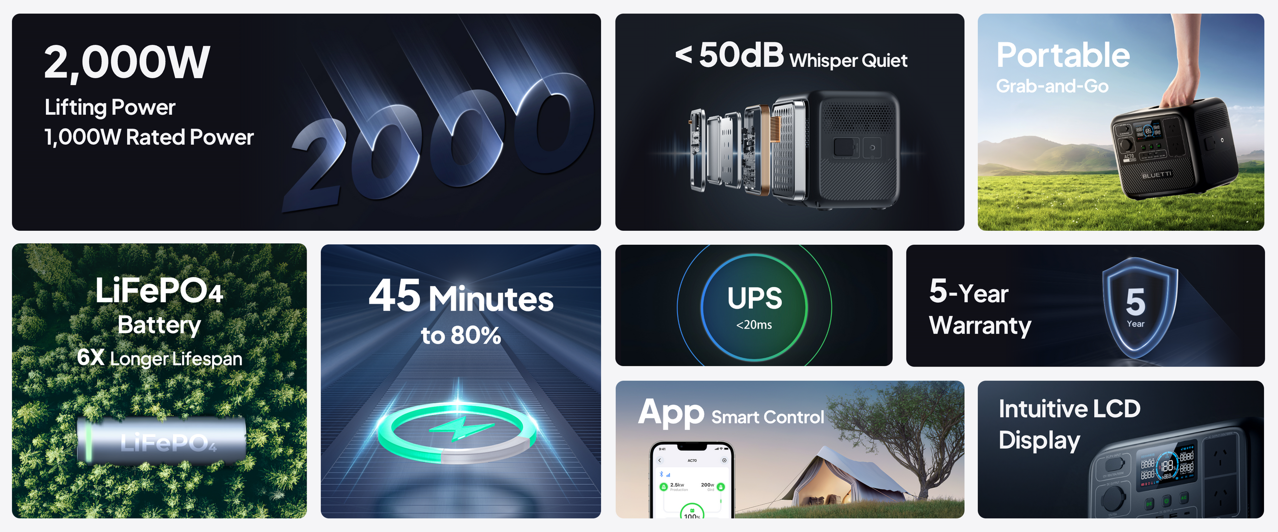 768Wh(32V,24Ah)2×230V/4.3A,1000W In Total950W Max.500W Max.,12-58VDC,10ALiFePO₄3000+ CyclesBLUETTI App (Bluetooth)12.4*8.2*10.1in / 314*209.5*255.8mm22.5 lbs(10.2 kg)