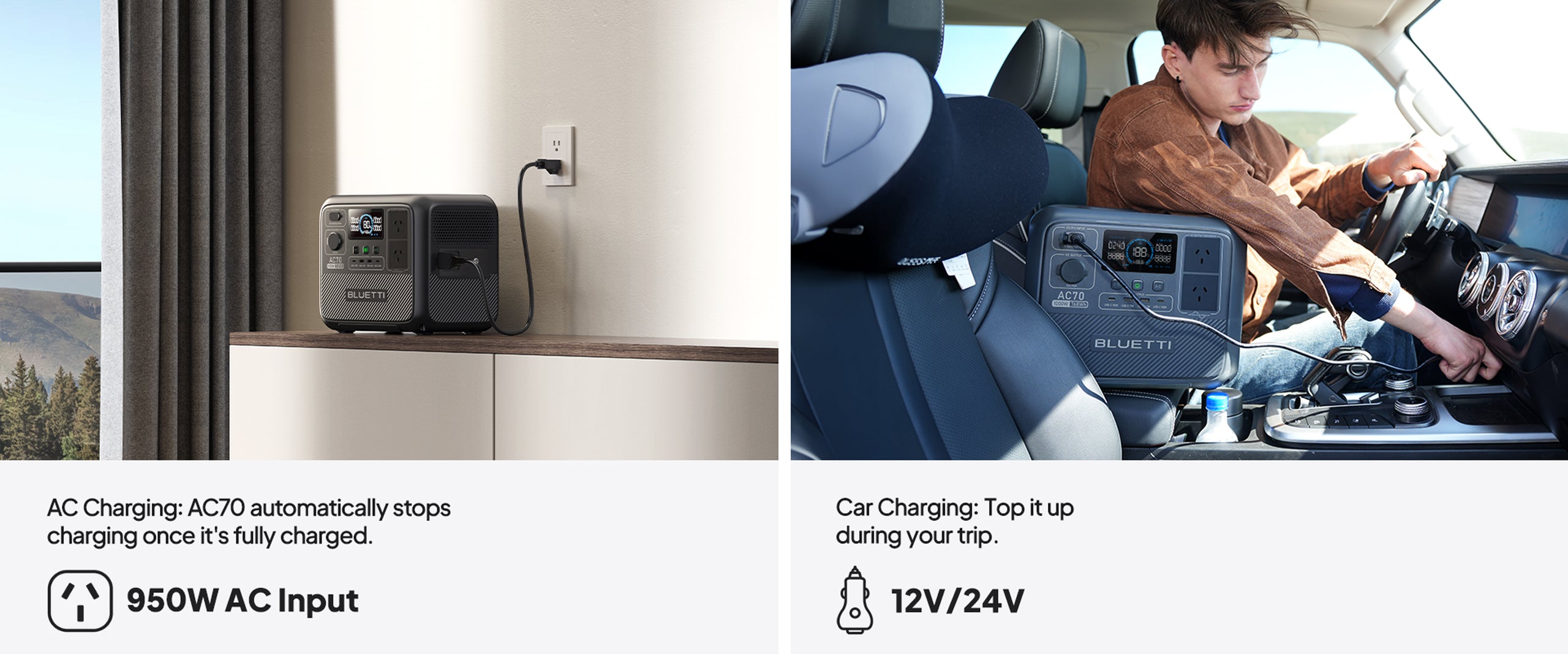 A:AC70 supports up to 950W AC input. Plug it into a wall outlet and enable the Turbo Charging mode on the BLUETTI App, and you can fill it up in only 1.3-1.6 Hours .