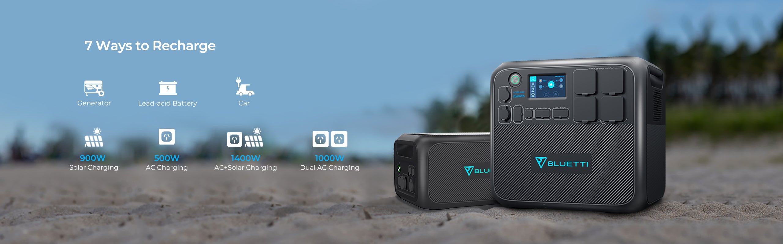 BLUETTI first expandable power station-AC200MAX with 2,048Wh LiFePO₄ cells and 2,200W pure sine wave inverter. Your mobile power center at home or on the way.